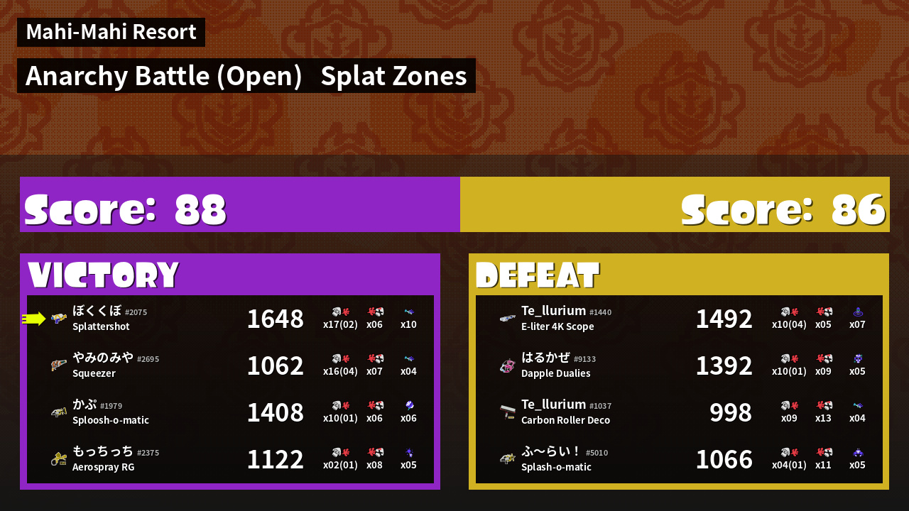 | Mode | Splat Zones - Anarchy Battle (Open) | ||