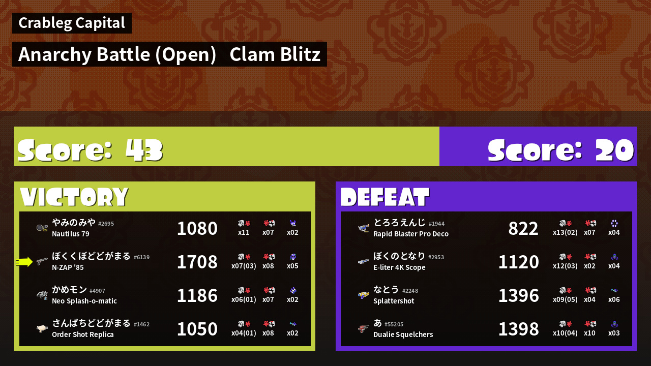 | Mode | Clam Blitz - Anarchy Battle (Open) |