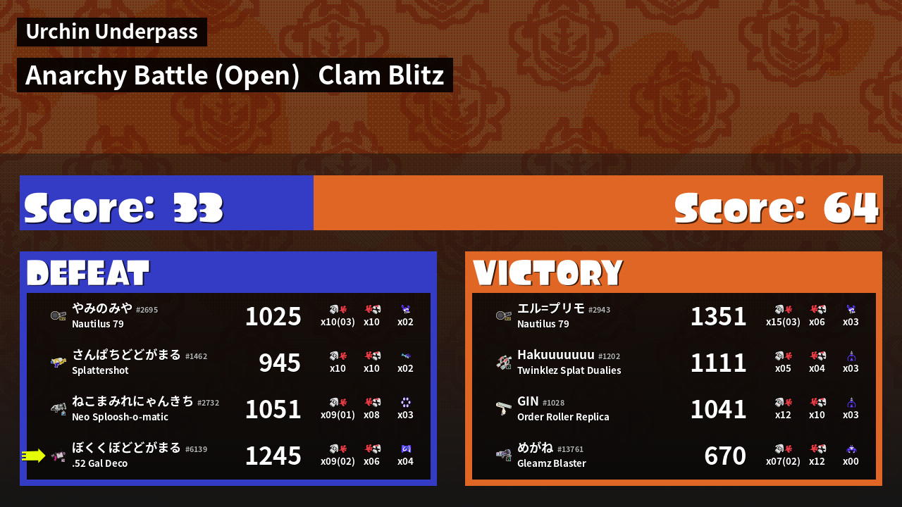 | Weapon | .52 Gal Deco ( Curling Bomb / Splattercolor Screen) |