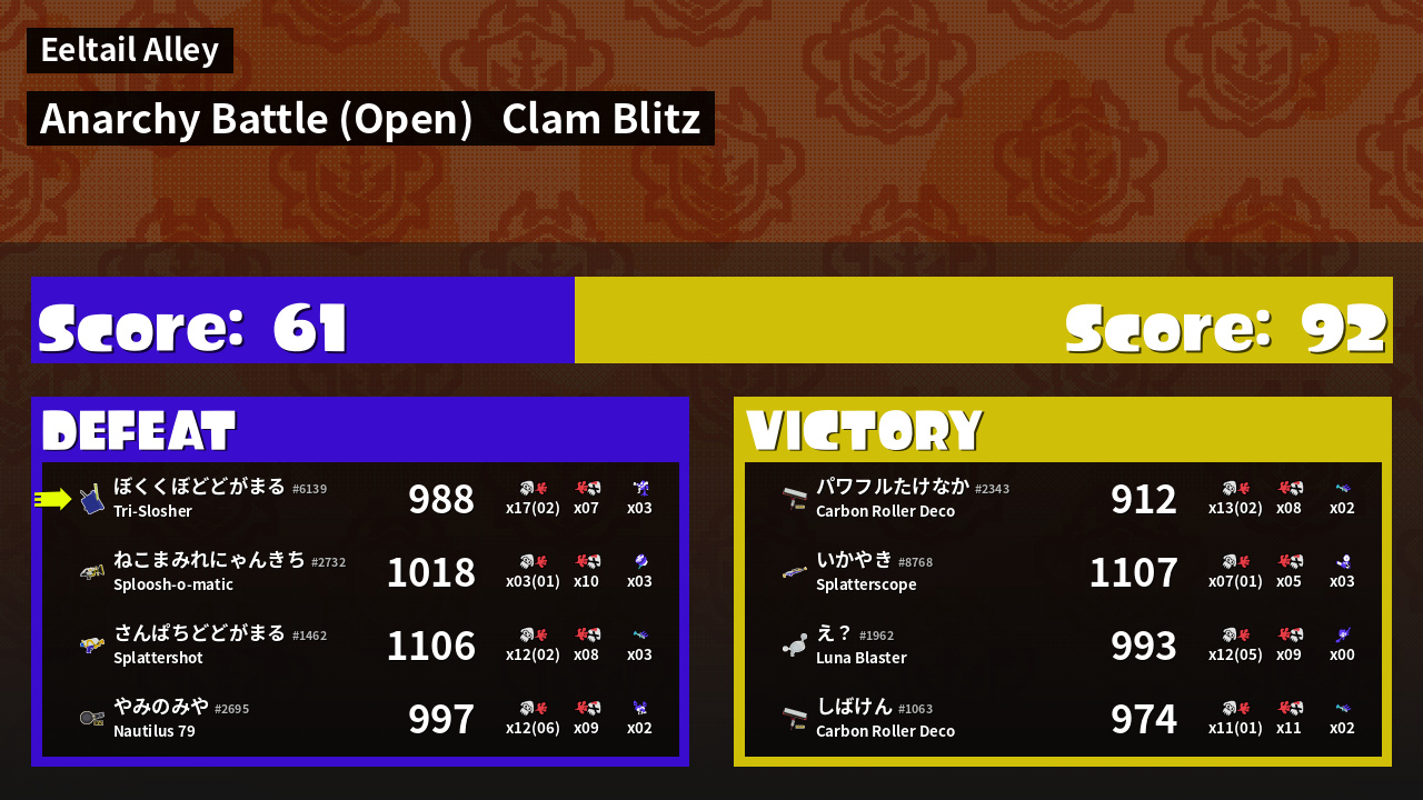 | Mode | Clam Blitz - Anarchy Battle (Open) |