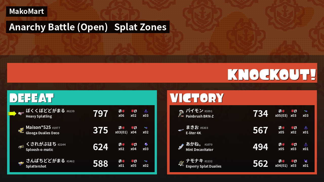 | Mode | Splat Zones - Anarchy Battle (Open) |