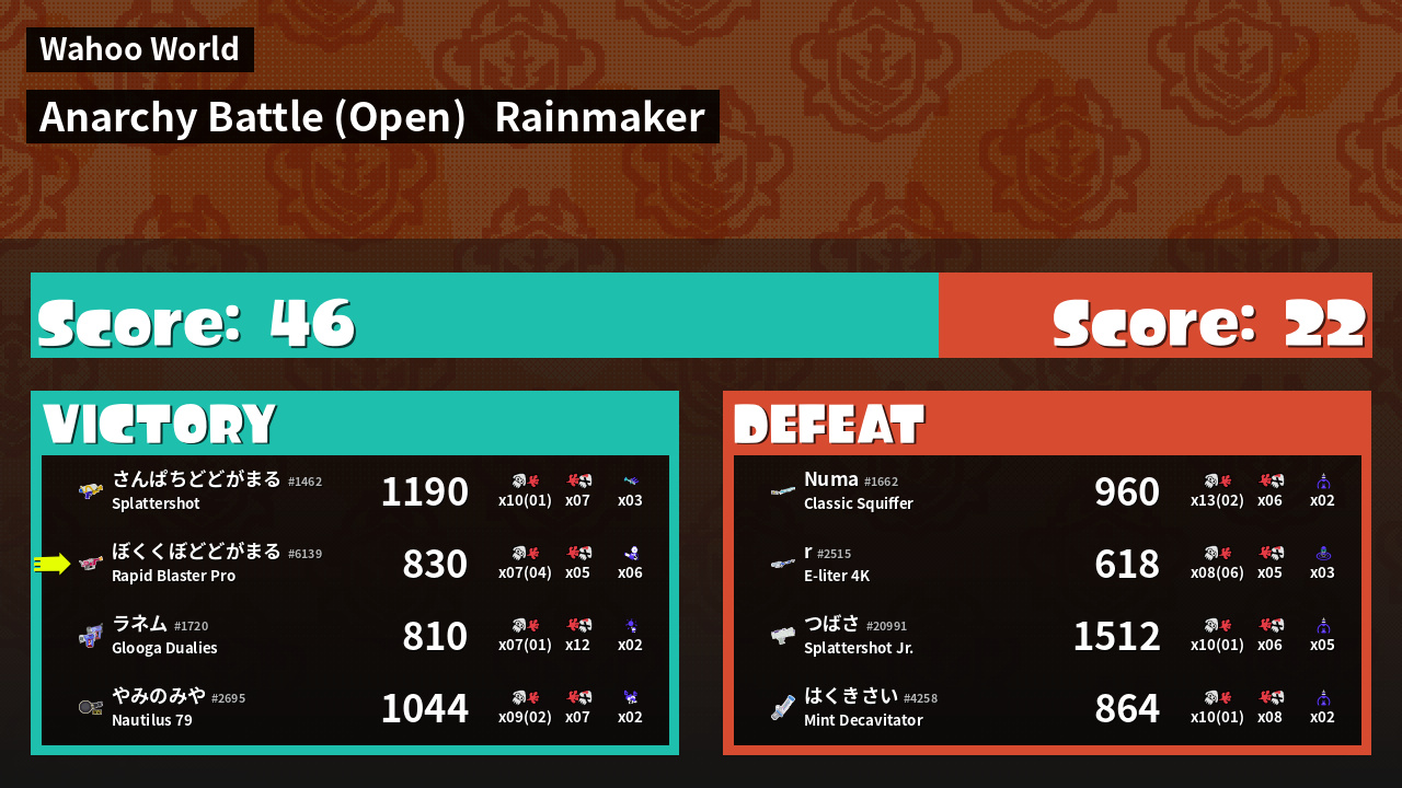 | Mode | Rainmaker - Anarchy Battle (Open) |