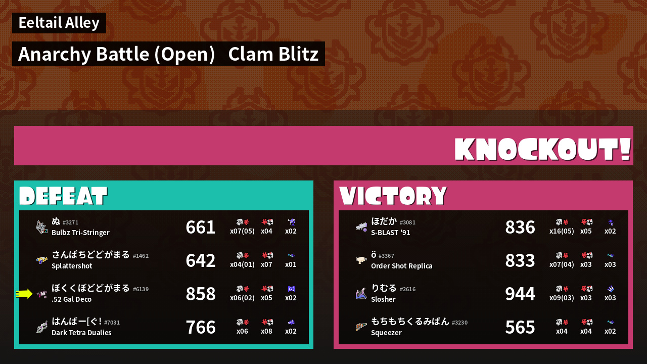 | Weapon | .52 Gal Deco ( Curling Bomb / Splattercolor Screen) |