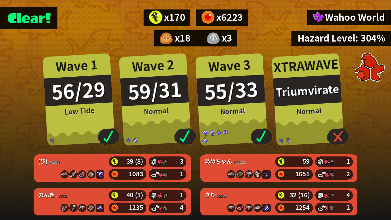 | Weapons | Range Blaster Splatana Wiper Dapple Dualies Grizzco Dualies | Range Blaster Explosher Grizzco Roller Grizzco Stringer | Douser Dualies FF Octobrush Grizzco Roller Grizzco Dualies | Grizzco Roller Rapid Blaster Pro Grizzco Roller Grizzco Brella |