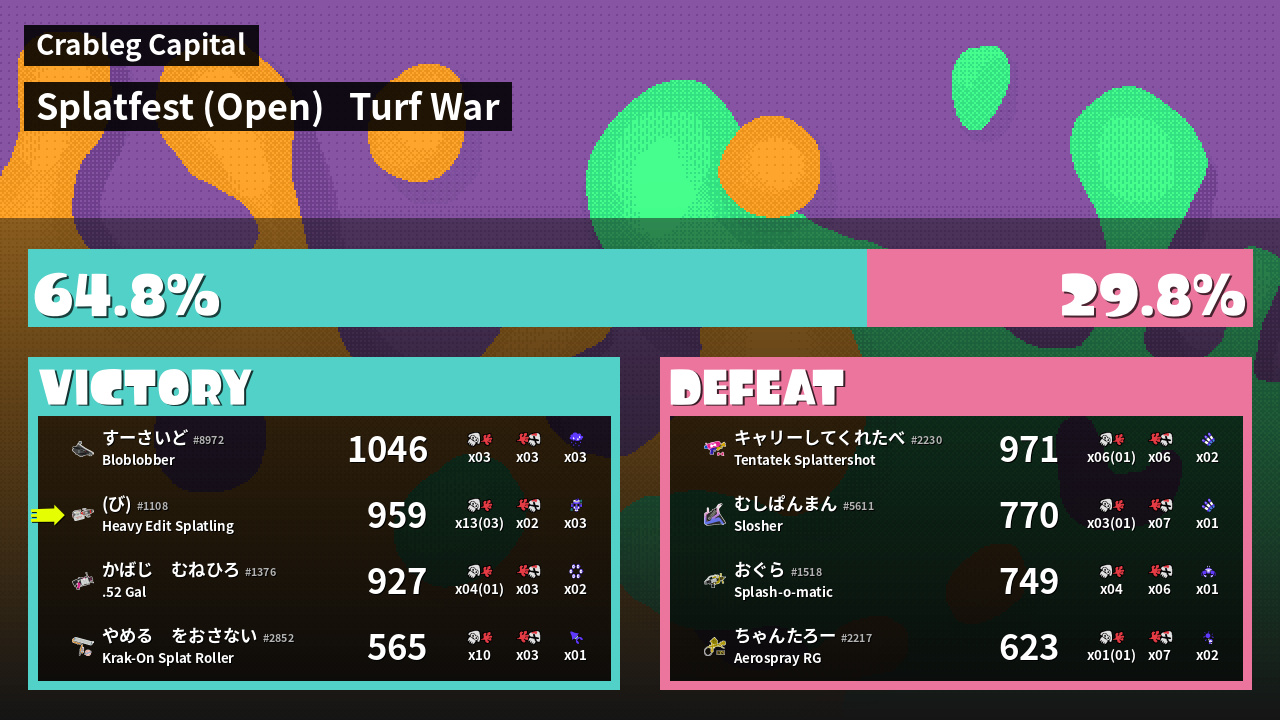 | Medals | #1 Overall Splatter #1 Enemy-Base Inker #1 Enemy Splatter | ||