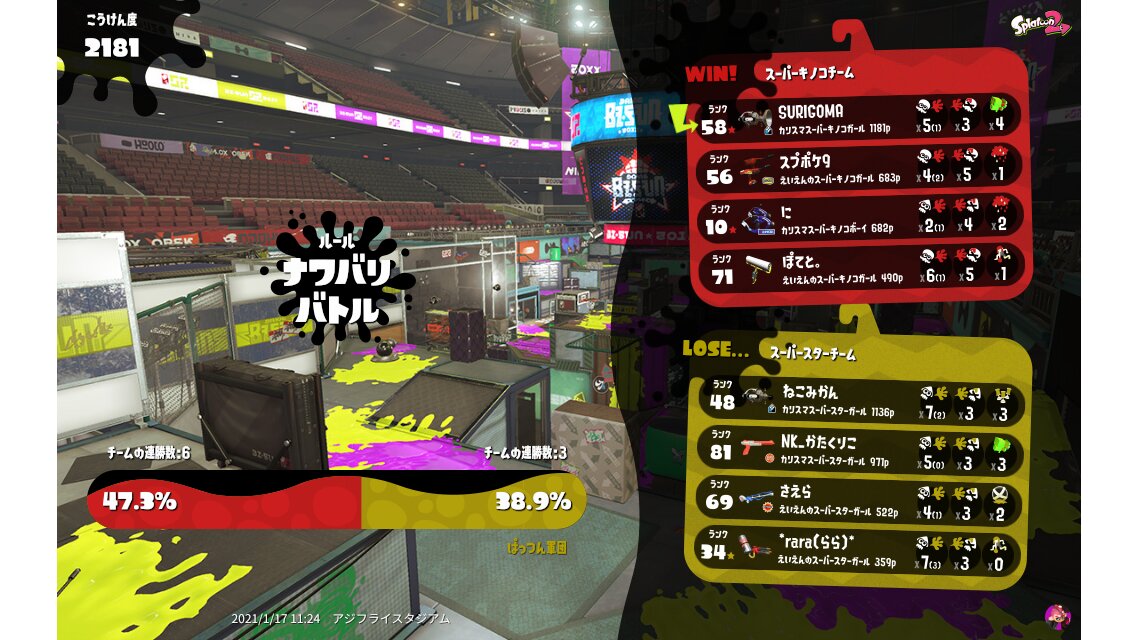 | Team スーパーキノコ Win Streak: 6 | 3,036 | 12 / 17 | 0.71 41.38% | ||||