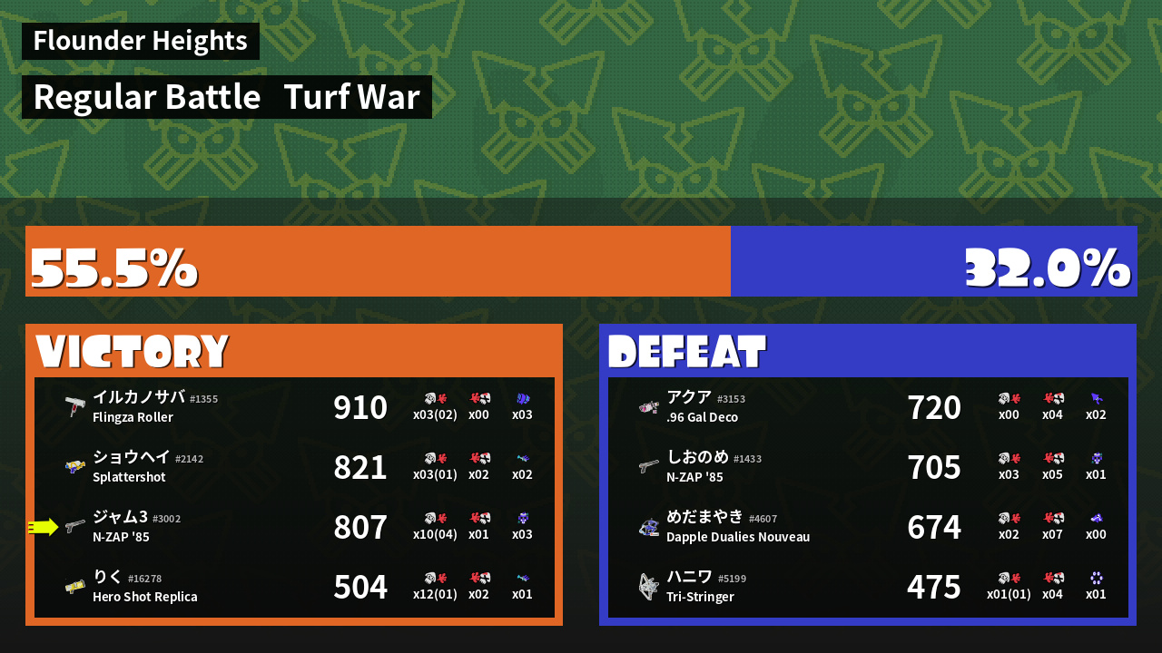 | Medals | #1 Enemy-Base Inker #1 Super Jump Spot #1 Splat Assister | ||
