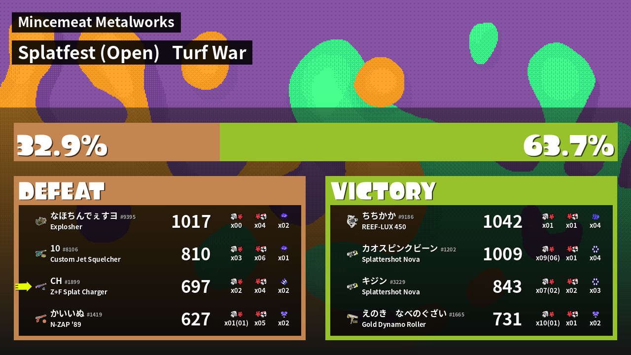 | Marooner's Bay Raider  カオスピンクビーン #1202 |  Splattershot Nova                    | 1,009 | 3 + 6 | 1 | 3.00 |  4 | |