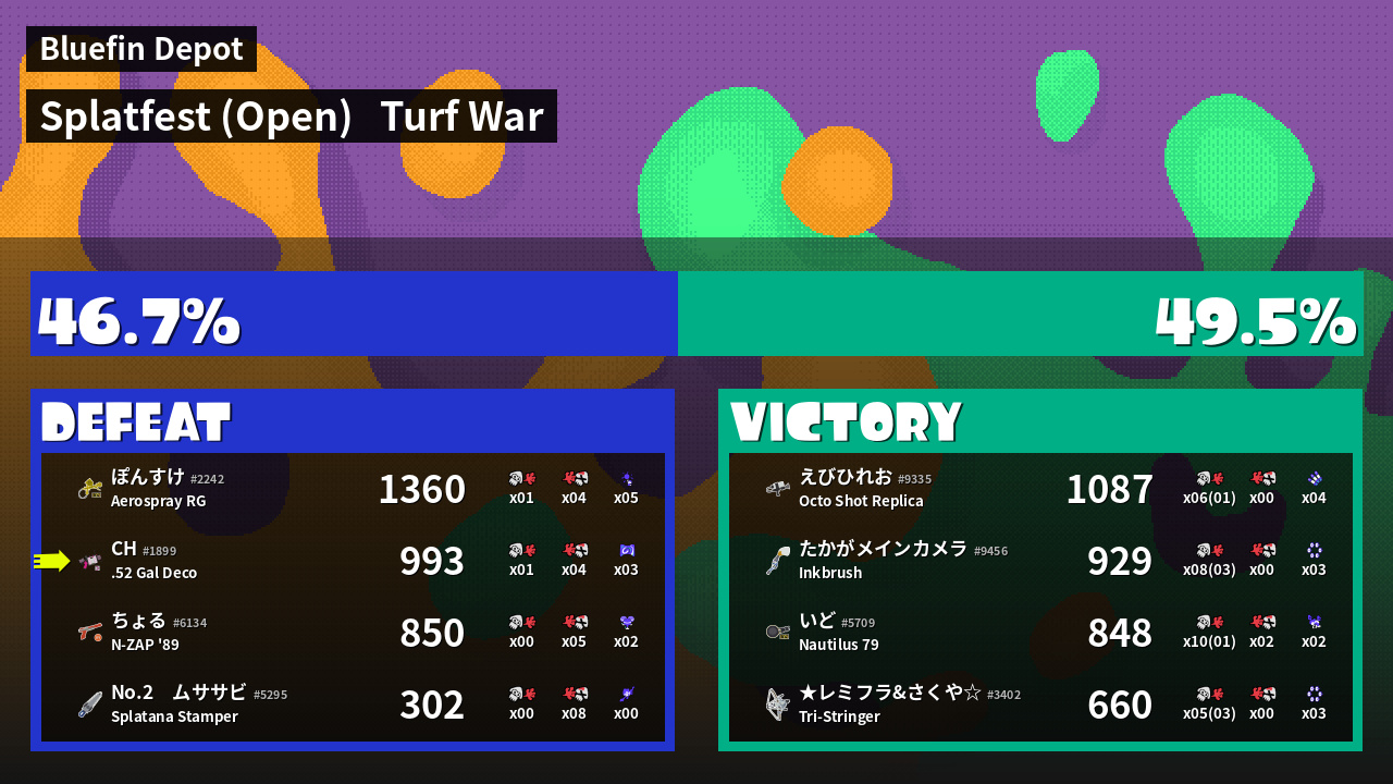 | Name | Weapon | Inked |  k |  d | KR | Sp | |