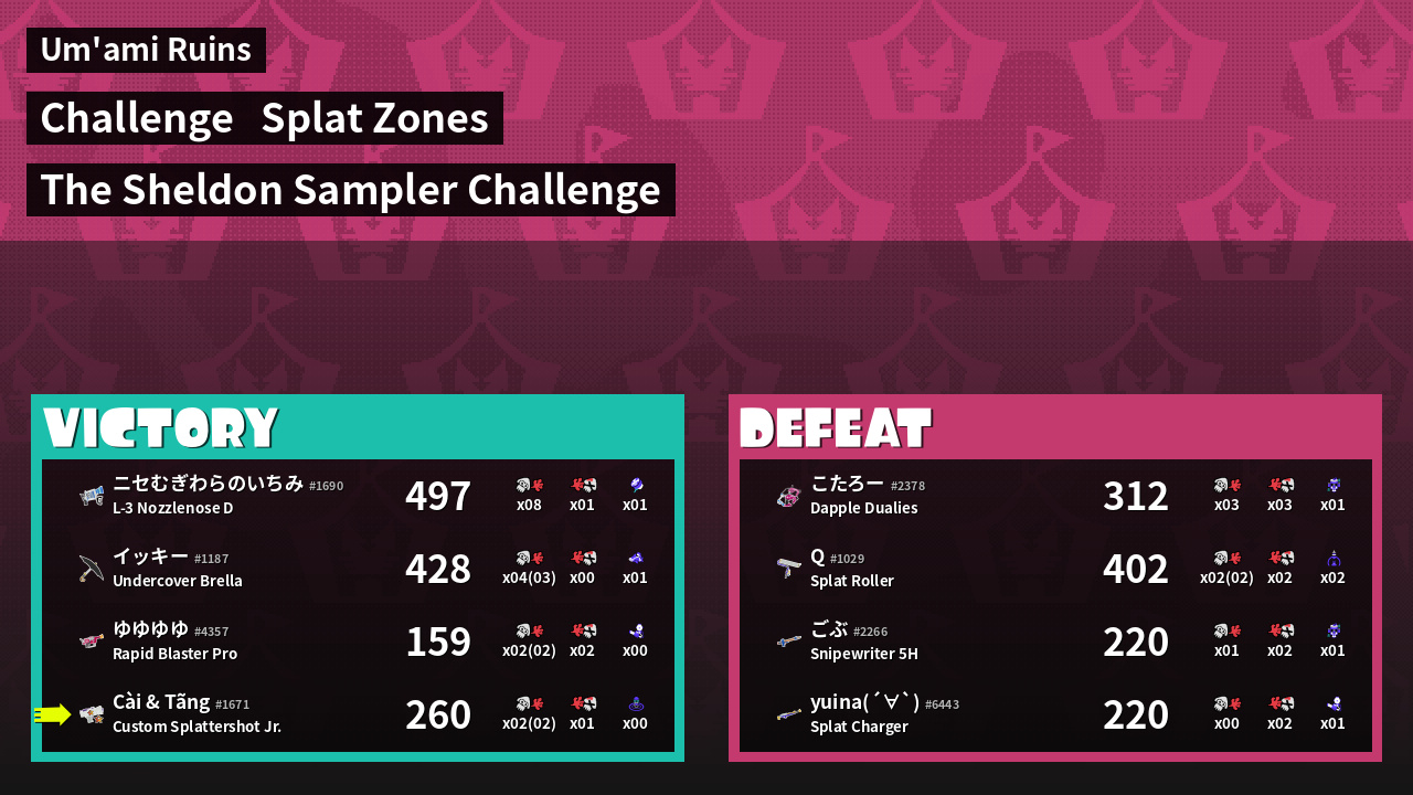 | Medals | #1 Splat Zone Hero #1 Ink Consumer #2 Super Jump Spot |
