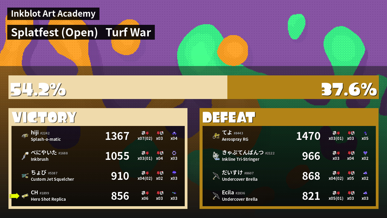 | Medals | #1 Enemy-Base Inker #1 Enemy Splatter First Splat! | ||