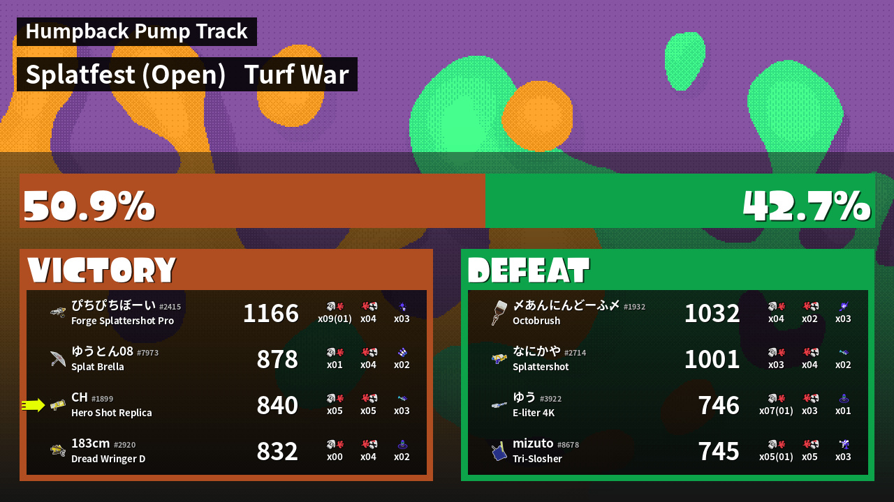 | Medals | #1 Ground Traveler #1 Trizooka User #2 Overall Splatter | ||