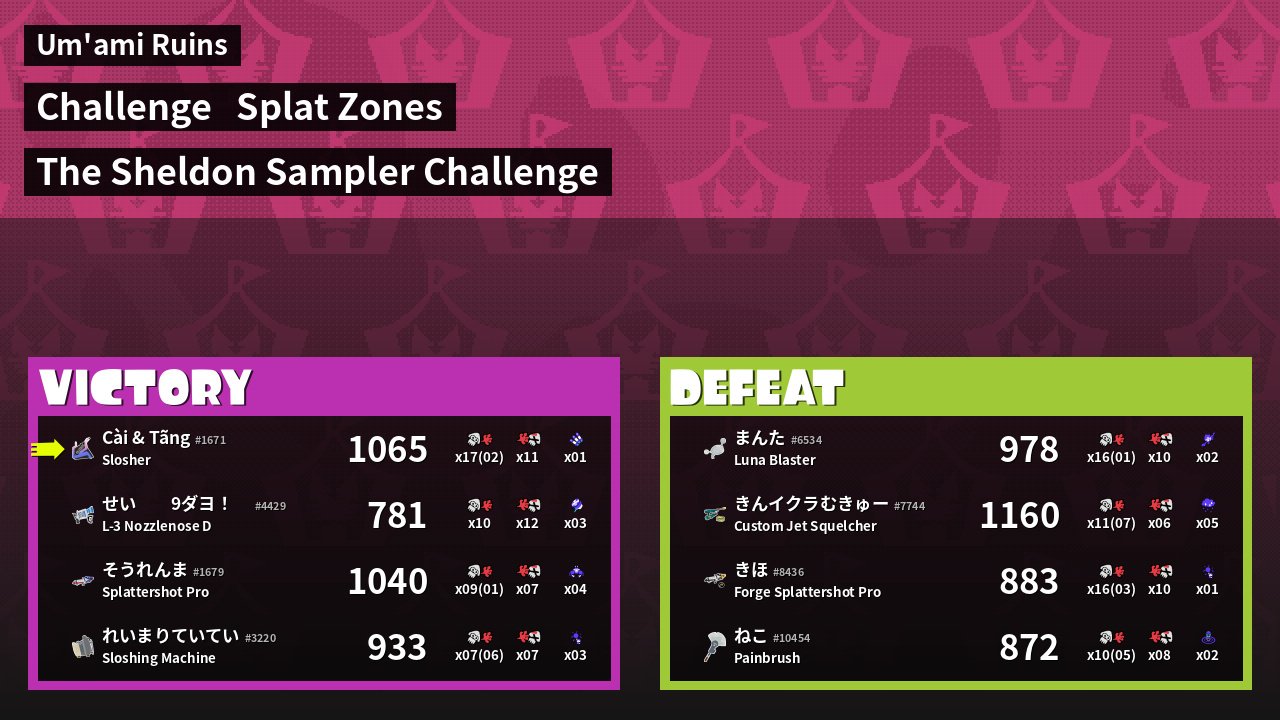 | Challenge | The Sheldon Sampler Challenge Make the most of random weapons! |
