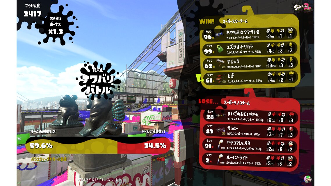 | Team スーパーキノコ イカ会 Win Streak: 1 | 3,382 | 9 / 20 | 0.45 31.03% | ||||