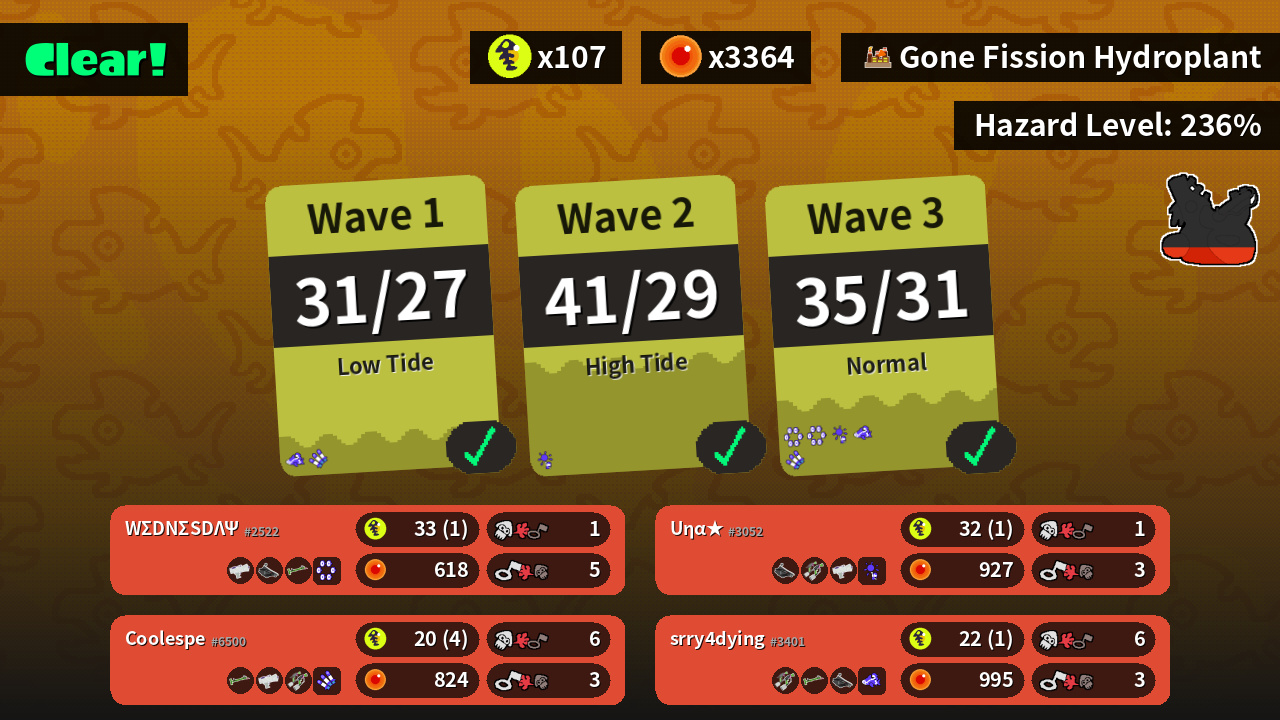 | Weapons | Splattershot Jr. Bloblobber Bamboozler 14 Mk I | Bloblobber Splat Dualies Splattershot Jr. | Splat Dualies Bamboozler 14 Mk I Bloblobber | Bamboozler 14 Mk I Splattershot Jr. Splat Dualies |