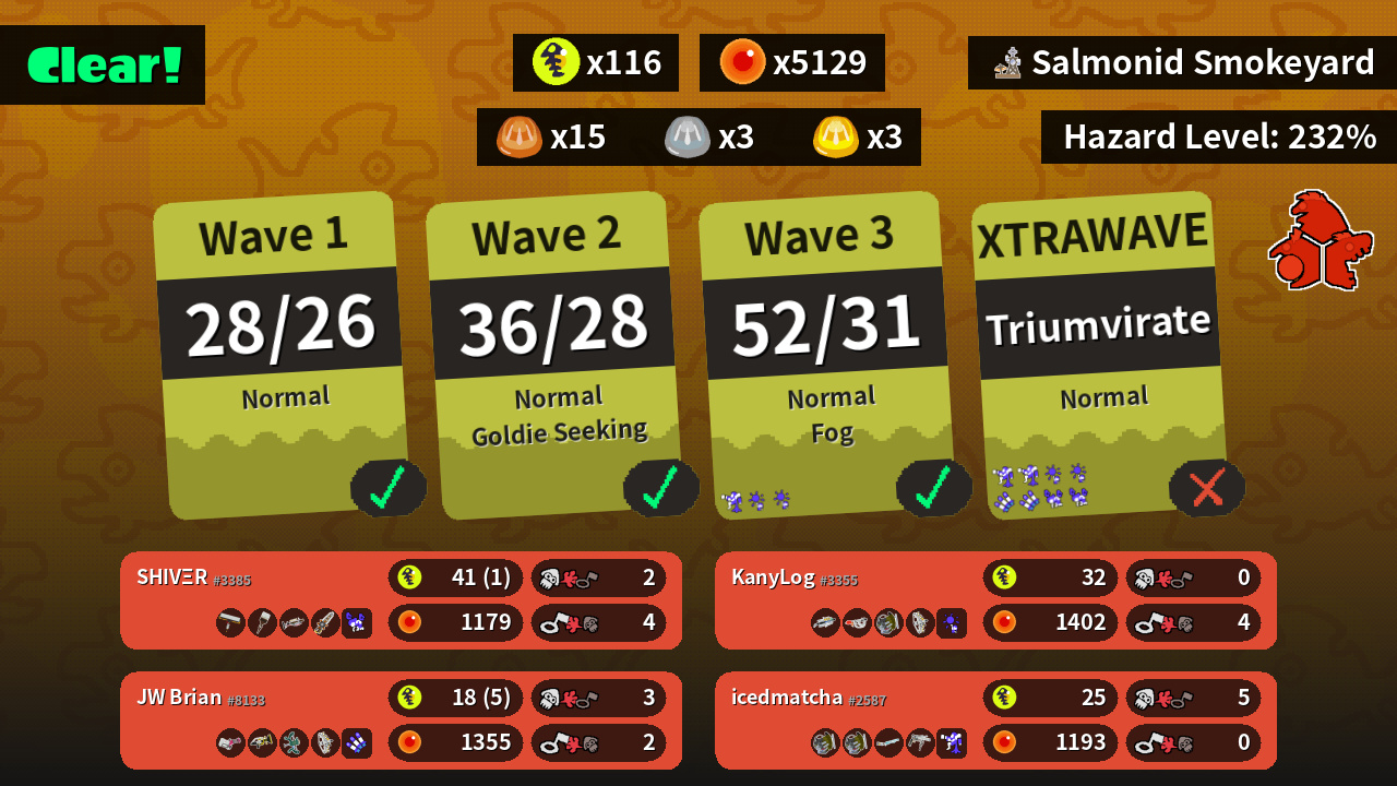 | Weapons | Carbon Roller Octobrush Grizzco Charger Grizzco Splatana | Grizzco Brella Goo Tuber Grizzco Slosher Grizzco Stringer | Grizzco Slosher Grizzco Slosher Classic Squiffer Grizzco Roller | Heavy Splatling Sploosh-o-matic Wellstring V Grizzco Stringer |