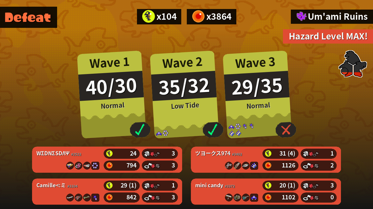 | Weapons | Splattershot Dapple Dualies Goo Tuber | Aerospray MG Grizzco Splatana Grizzco Brella | Classic Squiffer Dualie Squelchers Bamboozler 14 Mk I | Carbon Roller Explosher Jet Squelcher |