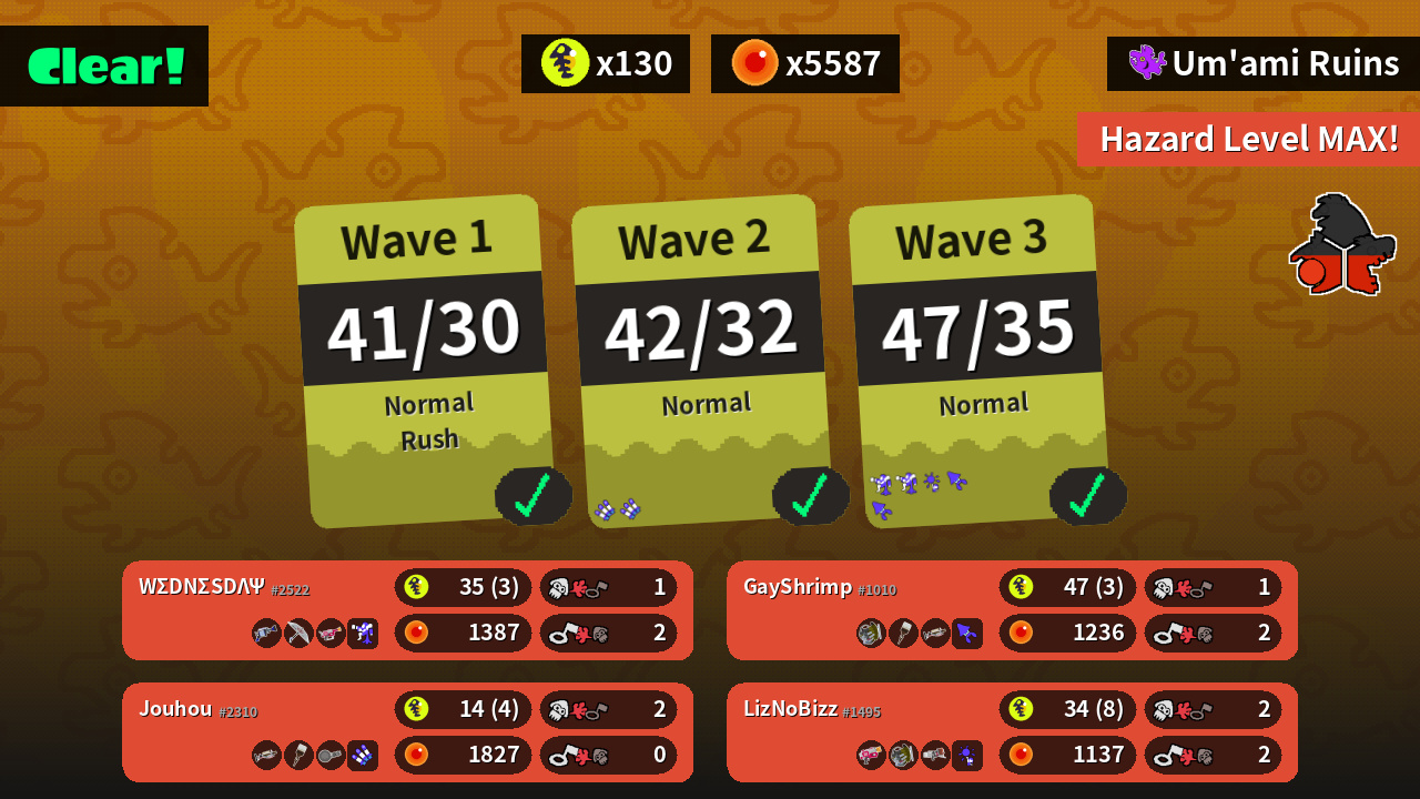 | Weapons | H-3 Nozzlenose Splat Brella Rapid Blaster Pro | Grizzco Slosher Octobrush Grizzco Charger | Rapid Blaster Grizzco Slosher Blaster | Grizzco Charger Octobrush Nautilus 47 |