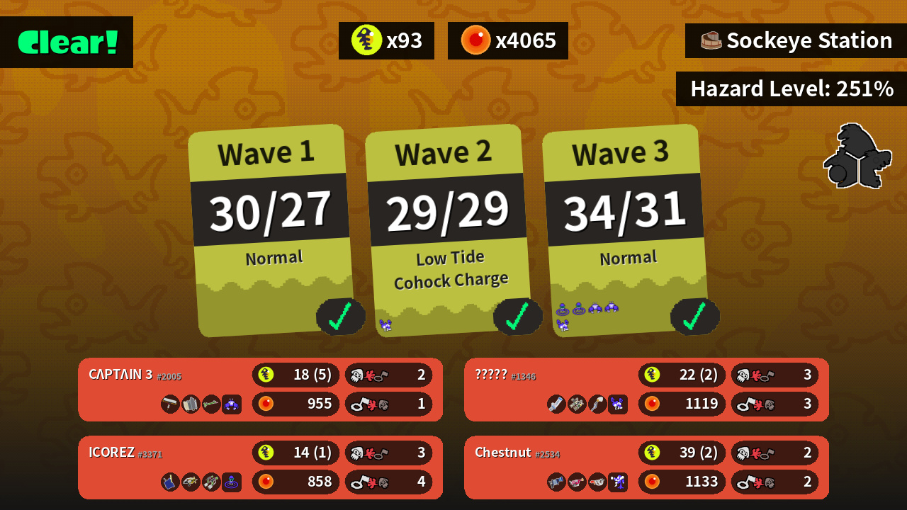 | Weapons | Carbon Roller Sloshing Machine Bamboozler 14 Mk I | L-3 Nozzlenose Rapid Blaster Pro Goo Tuber | Mint Decavitator Grizzco Dualies Inkbrush | Tri-Slosher Splash-o-matic Splat Dualies |