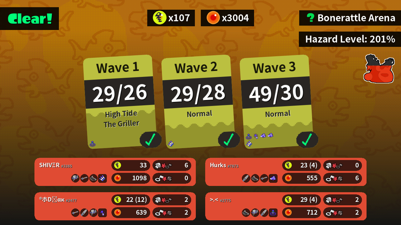 | Weapons | Clash Blaster Snipewriter 5H Bloblobber | Bloblobber Clash Blaster Splatana Stamper | Splatana Stamper Bloblobber Snipewriter 5H | Snipewriter 5H Splatana Stamper Clash Blaster |