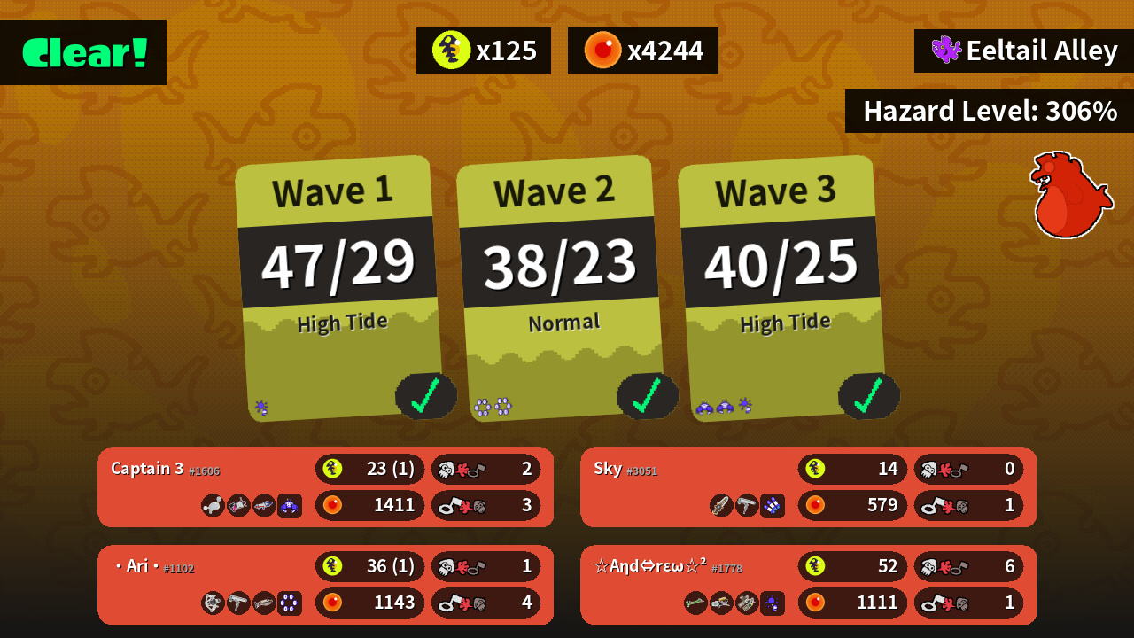 | Weapons | Luna Blaster .52 Gal Splattershot Pro | Bamboozler 14 Mk I Grizzco Blaster Grizzco Dualies | REEF-LUX 450 Dynamo Roller Grizzco Charger | Grizzco Splatana Dynamo Roller ? |