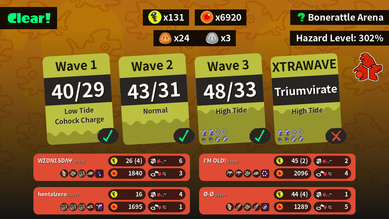| Weapons | Grizzco Stringer Grizzco Dualies Grizzco Slosher Grizzco Brella | Grizzco Roller Grizzco Roller Grizzco Dualies Grizzco Brella | Grizzco Stringer Grizzco Splatana Grizzco Dualies Grizzco Splatana | Grizzco Slosher Grizzco Slosher Grizzco Slosher Grizzco Blaster |