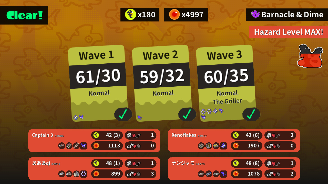 | Weapons | Range Blaster Splat Dualies Splatana Wiper | Grizzco Charger L-3 Nozzlenose Ballpoint Splatling | Grizzco Brella Grizzco Blaster Sloshing Machine | Grizzco Dualies Grizzco Slosher Dread Wringer |