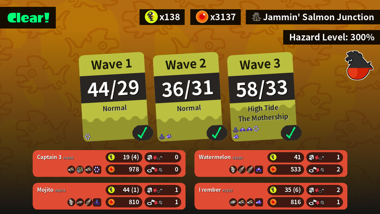 | Weapons | Grizzco Blaster Grizzco Slosher Grizzco Blaster | Grizzco Stringer Grizzco Charger Grizzco Splatana | Grizzco Stringer Grizzco Splatana Grizzco Splatana | Grizzco Brella Grizzco Blaster Grizzco Blaster |