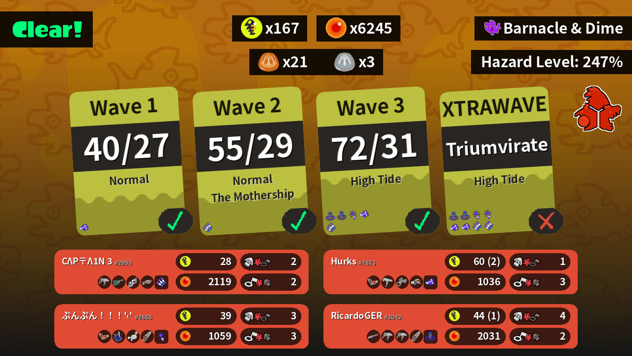 | Weapons | Grizzco Roller Jet Squelcher Dark Tetra Dualies Grizzco Charger | Hydra Splatling Dynamo Roller Aerospray MG Grizzco Blaster | Splat Charger Grizzco Roller Grizzco Roller Grizzco Splatana | Hydra Splatling Tri-Slosher Luna Blaster Grizzco Splatana |