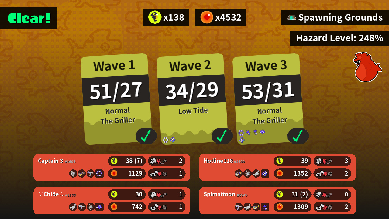 | Weapons | Tri-Stringer Mini Splatling Big Swig Roller | Mini Splatling Tri-Stringer Luna Blaster | Big Swig Roller Luna Blaster Mini Splatling | Luna Blaster Big Swig Roller Tri-Stringer |