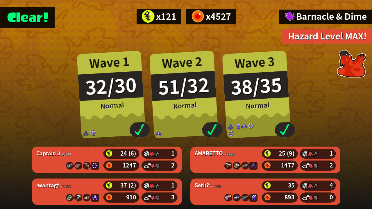 | Weapons | L-3 Nozzlenose Dualie Squelchers Tenta Brella | Splat Dualies Painbrush .96 Gal | Rapid Blaster Splattershot Pro Jet Squelcher | Carbon Roller Grizzco Dualies Grizzco Charger |