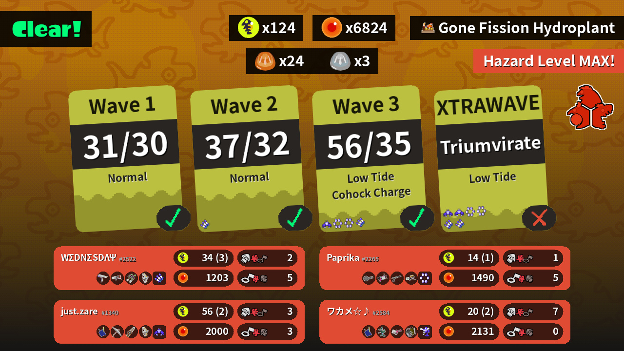 | Weapons | Splat Roller Blaster Splat Dualies Grizzco Stringer | Tri-Slosher Recycled Brella 24 Mk I Grizzco Splatana Grizzco Stringer | Tri-Slosher Wellstring V Heavy Splatling Grizzco Slosher | Nautilus 47 .52 Gal N-ZAP '85 Grizzco Blaster |
