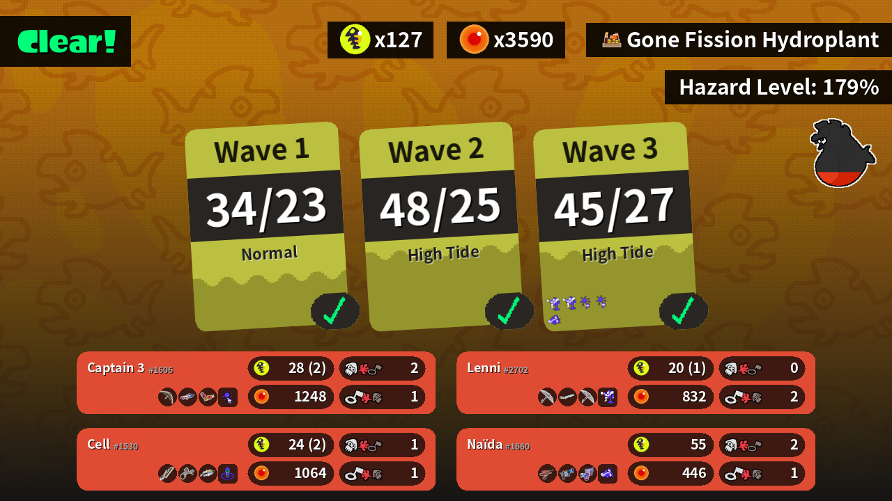 | Weapons | Tenta Brella Splattershot Pro Hydra Splatling | Dualie Squelchers L-3 Nozzlenose Glooga Dualies | Splatana Wiper Aerospray MG Grizzco Brella | Splat Brella Classic Squiffer Splat Brella |