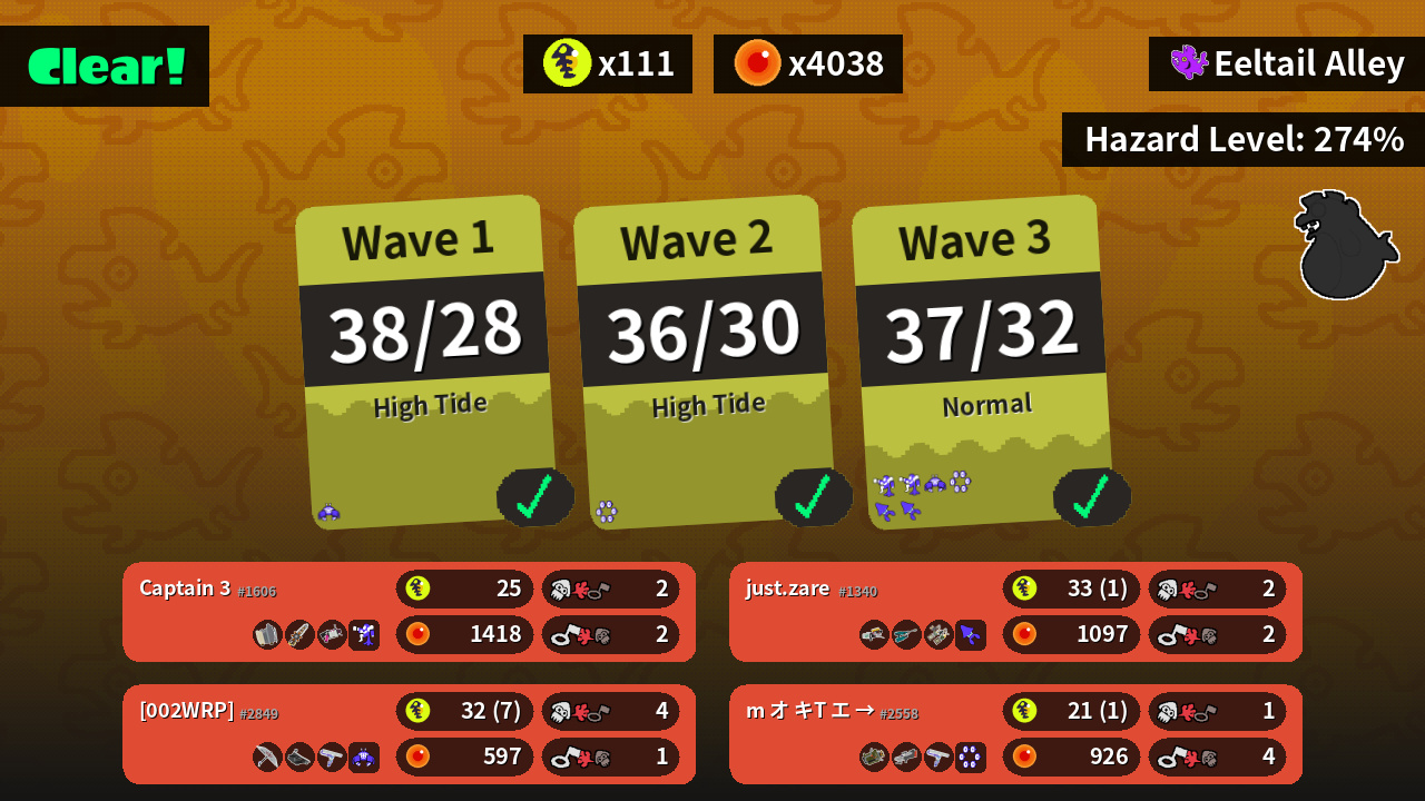 | Weapons | Sloshing Machine Grizzco Splatana .52 Gal | Grizzco Blaster Jet Squelcher Grizzco Dualies | Splat Brella Bloblobber Big Swig Roller | Explosher S-BLAST '92 Big Swig Roller |