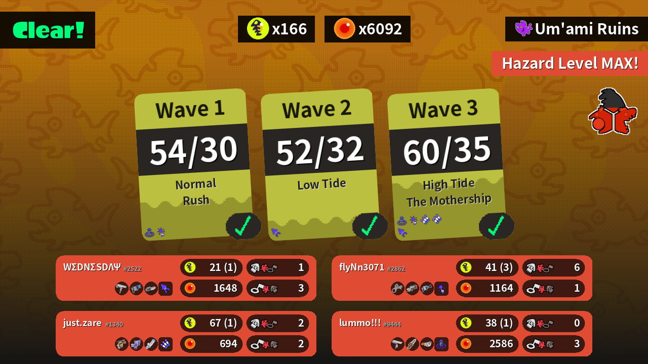 | Weapons | Dynamo Roller L-3 Nozzlenose Ballpoint Splatling | Douser Dualies FF Glooga Dualies Mint Decavitator | Aerospray MG S-BLAST '92 H-3 Nozzlenose | Splat Roller Grizzco Splatana Goo Tuber |
