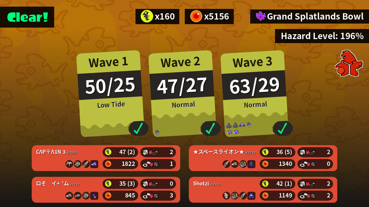 | Weapons | Grizzco Roller Grizzco Dualies Grizzco Splatana | Grizzco Stringer Grizzco Slosher Grizzco Splatana | Grizzco Splatana Grizzco Blaster Grizzco Slosher | Grizzco Blaster Grizzco Charger Grizzco Dualies |