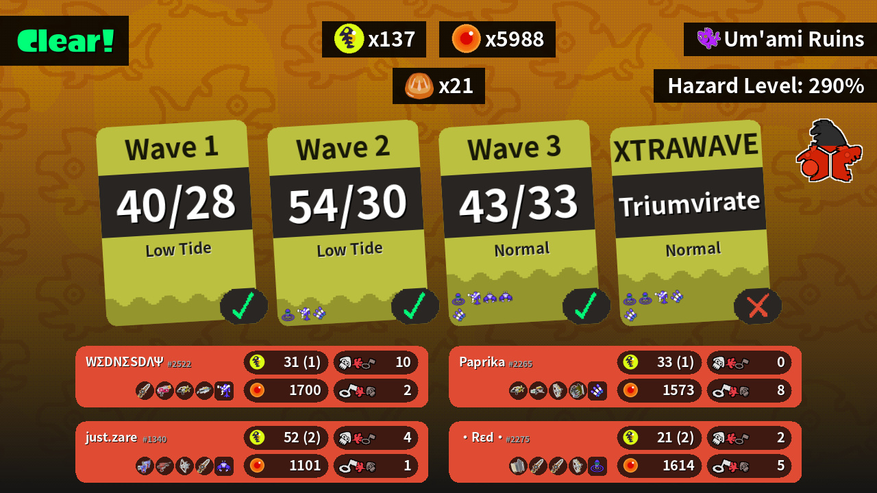| Weapons | Grizzco Splatana Rapid Blaster Splash-o-matic Grizzco Brella | Glooga Dualies Dualie Squelchers Tri-Stringer Grizzco Splatana | Splash-o-matic Grizzco Blaster Grizzco Stringer Grizzco Slosher | Sloshing Machine Grizzco Splatana Grizzco Splatana Grizzco Stringer |