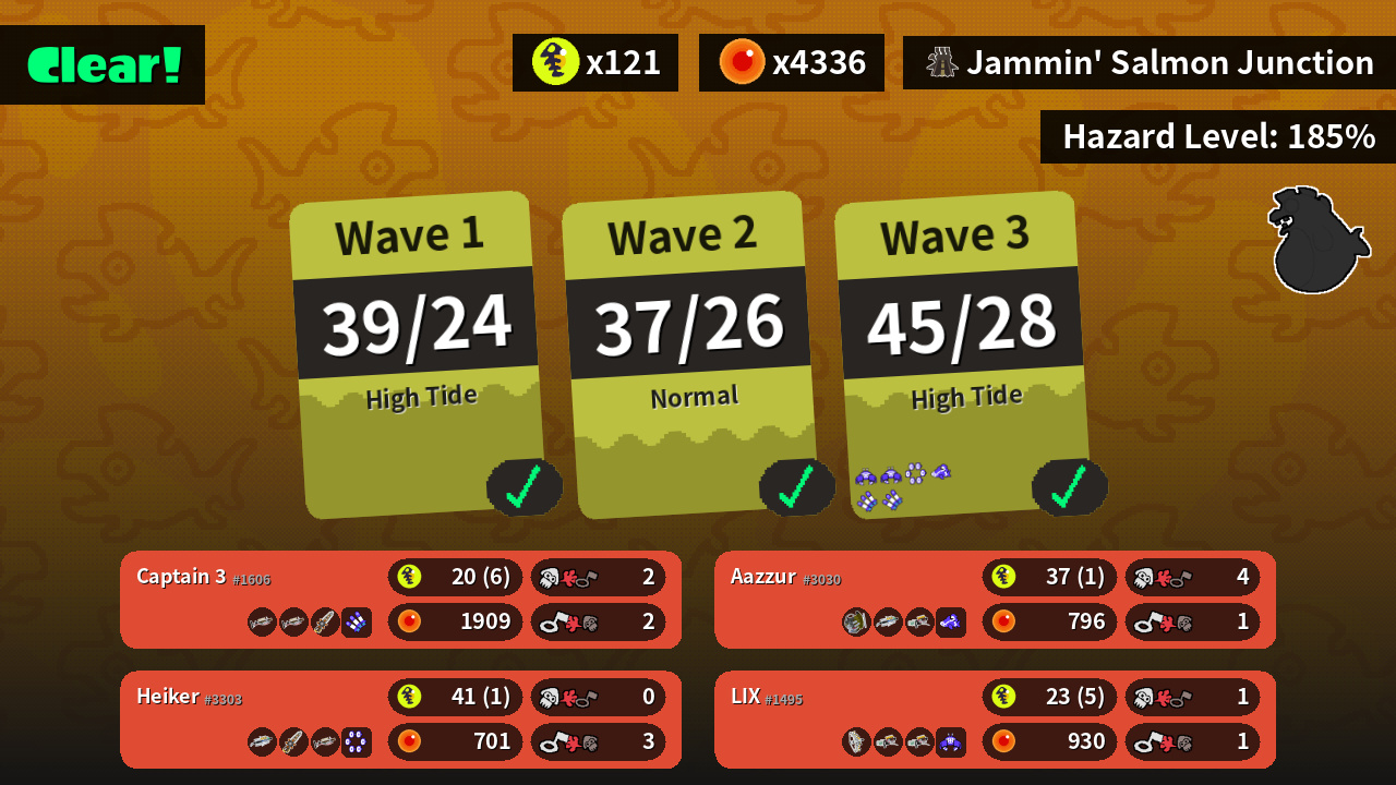 | Weapons | Grizzco Charger Grizzco Charger Grizzco Splatana | Grizzco Brella Grizzco Splatana Grizzco Charger | Grizzco Slosher Grizzco Brella Grizzco Blaster | Grizzco Stringer Grizzco Blaster Grizzco Blaster |