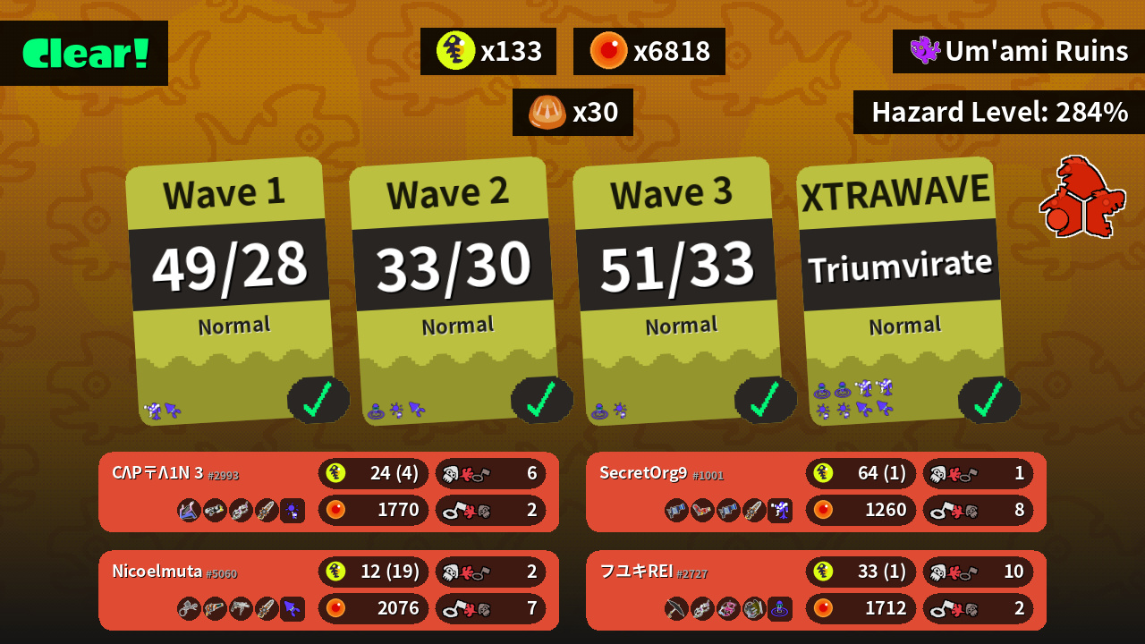 | Weapons | Slosher Splattershot Nova Dark Tetra Dualies Grizzco Splatana | L-3 Nozzlenose Hydra Splatling L-3 Nozzlenose Grizzco Splatana | Undercover Brella Dark Tetra Dualies Dapple Dualies Grizzco Slosher | Aerospray MG Squeezer Grizzco Roller Grizzco Splatana |