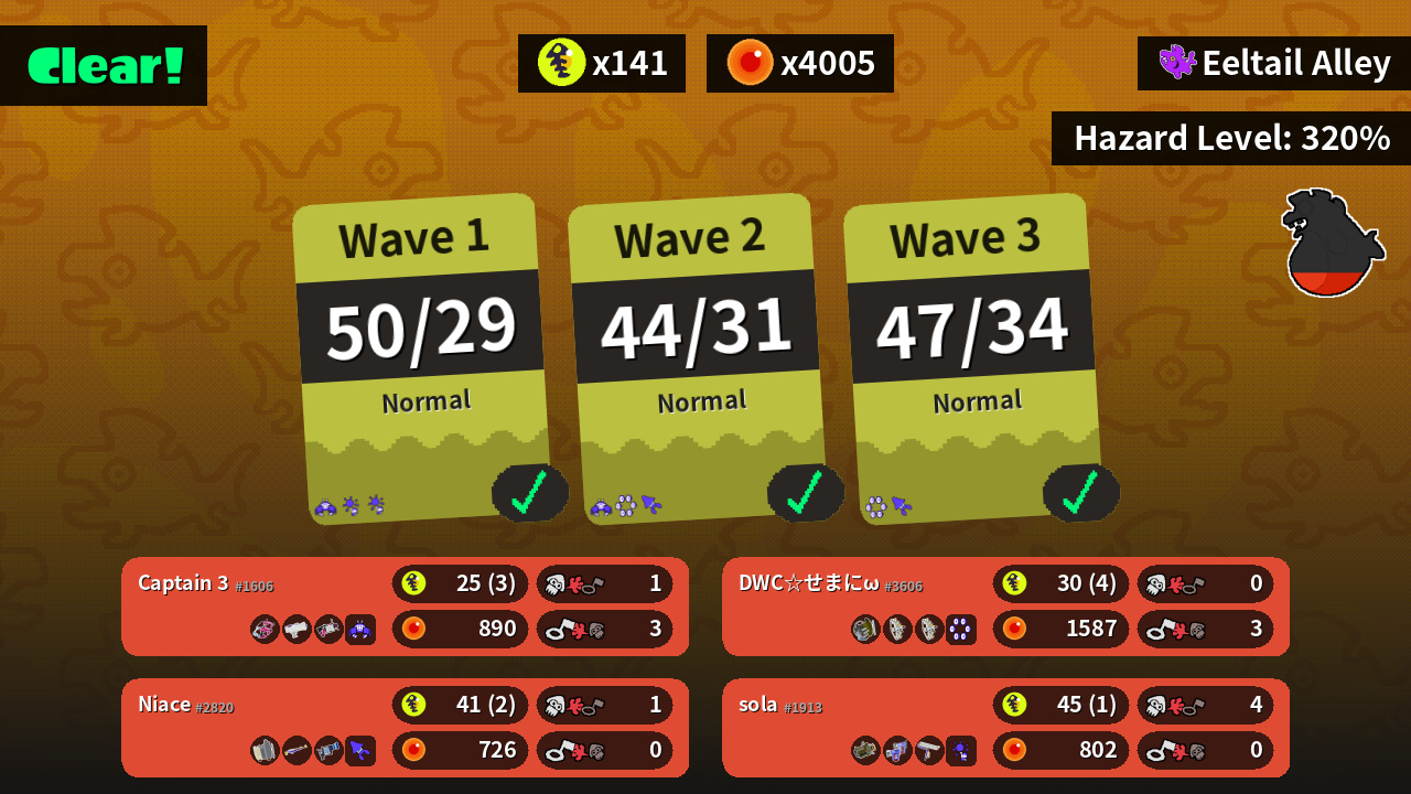 | Weapons | Dapple Dualies Splattershot Jr. .52 Gal | Explosher Glooga Dualies Splat Roller | Sloshing Machine Splat Charger L-3 Nozzlenose | Grizzco Slosher Grizzco Stringer Grizzco Stringer |