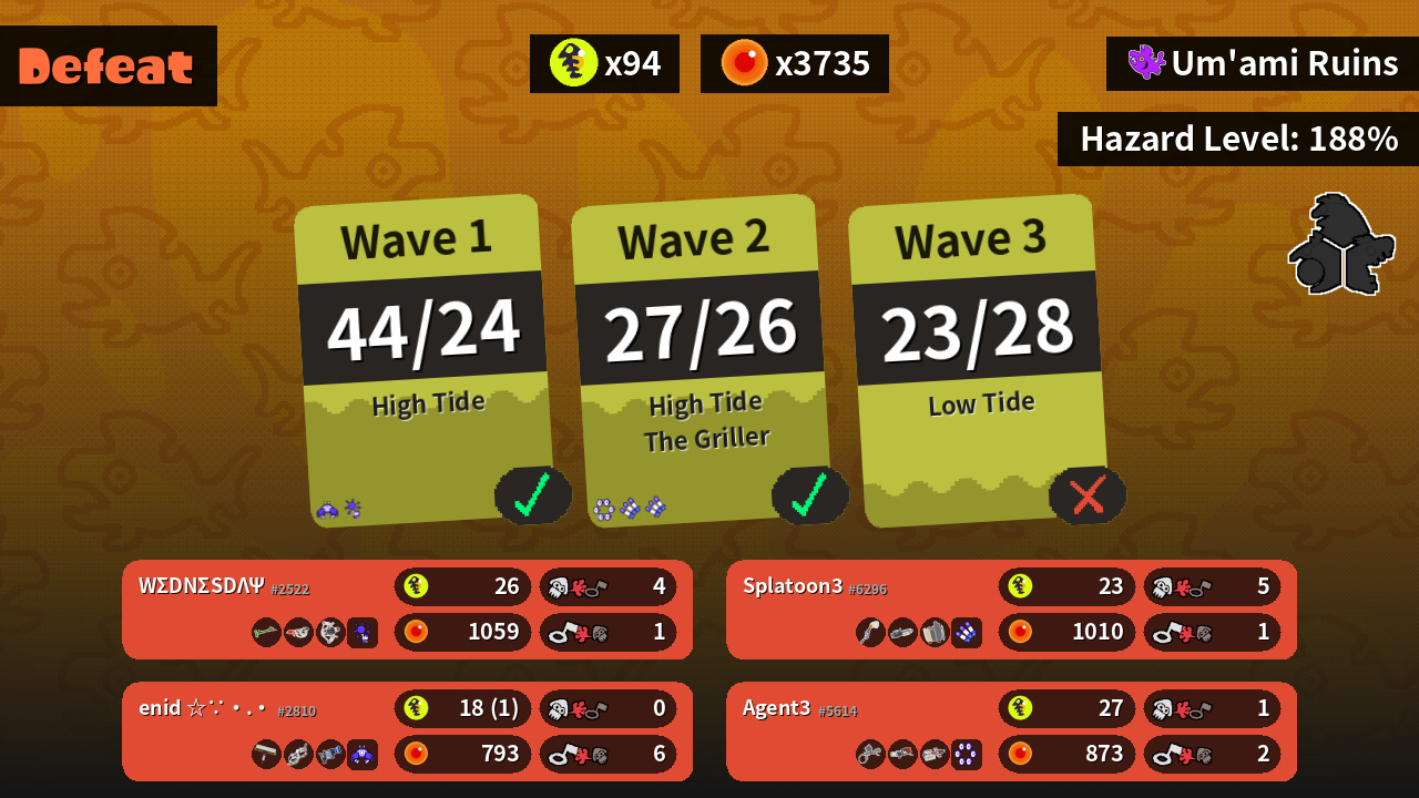 | Weapons | Bamboozler 14 Mk I Goo Tuber REEF-LUX 450 | Aerospray MG Range Blaster Heavy Edit Splatling | Inkbrush Ballpoint Splatling Sloshing Machine | Carbon Roller Dark Tetra Dualies L-3 Nozzlenose |