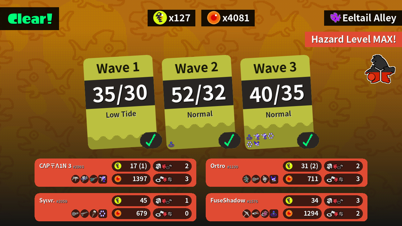 | Weapons | Grizzco Roller Clash Blaster Jet Squelcher | Nautilus 47 N-ZAP '85 Octobrush | Recycled Brella 24 Mk I Range Blaster Dapple Dualies | Wellstring V Nautilus 47 Tri-Stringer |