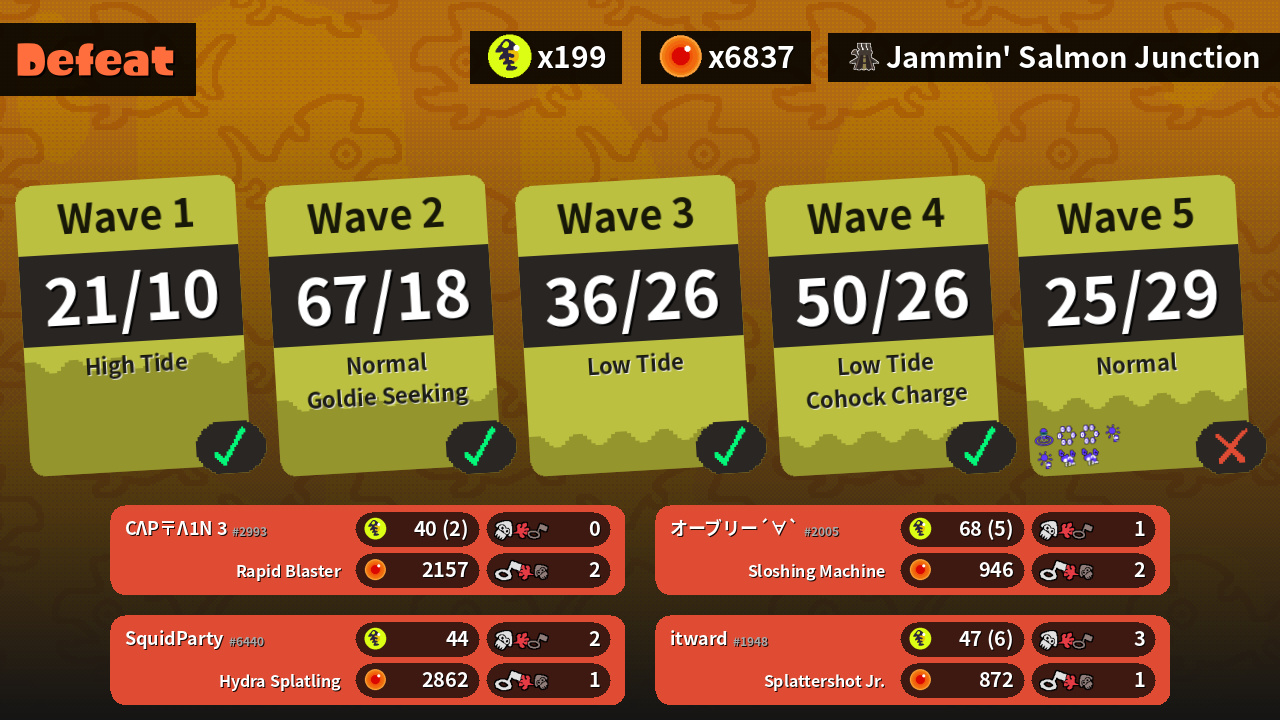 | Weapons | Rapid Blaster | Sloshing Machine | Splattershot Jr. | Hydra Splatling |