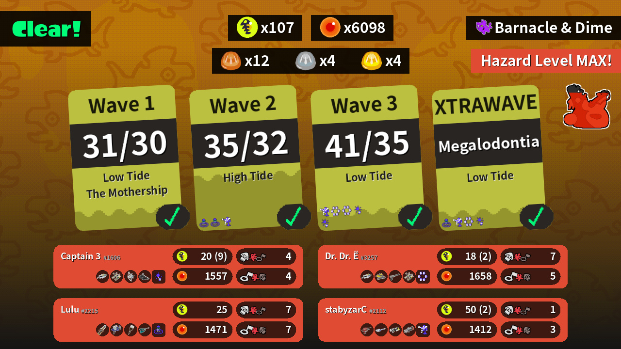 | Weapons | Grizzco Brella Grizzco Dualies Tri-Stringer Bloblobber | Dualie Squelchers E-liter 4K Splattershot Nova S-BLAST '92 | Grizzco Splatana Clash Blaster Octobrush Jet Squelcher | Grizzco Brella Dread Wringer N-ZAP '85 Grizzco Dualies |