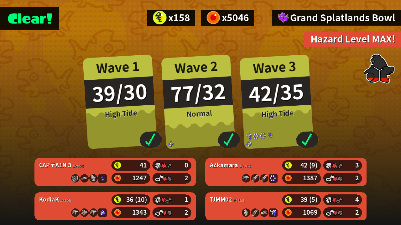 | Weapons | Grizzco Slosher Grizzco Charger Grizzco Stringer | Grizzco Roller Grizzco Splatana Grizzco Splatana | Grizzco Stringer Grizzco Splatana Grizzco Blaster | Grizzco Roller Grizzco Dualies Grizzco Roller |