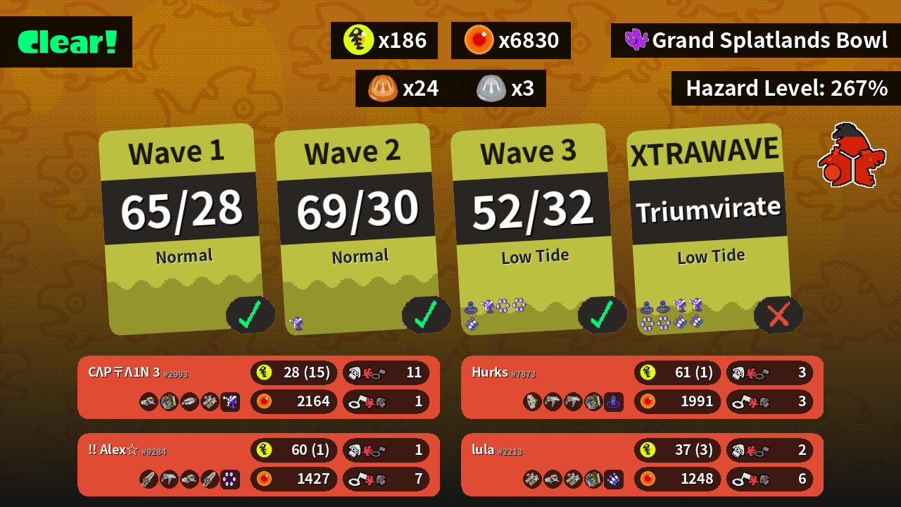 | Weapons | Grizzco Blaster Grizzco Slosher Grizzco Brella Grizzco Dualies | Grizzco Stringer Grizzco Roller Grizzco Roller Grizzco Slosher | Grizzco Splatana Grizzco Roller Grizzco Blaster Grizzco Splatana | Grizzco Dualies Grizzco Blaster Grizzco Dualies Grizzco Slosher |