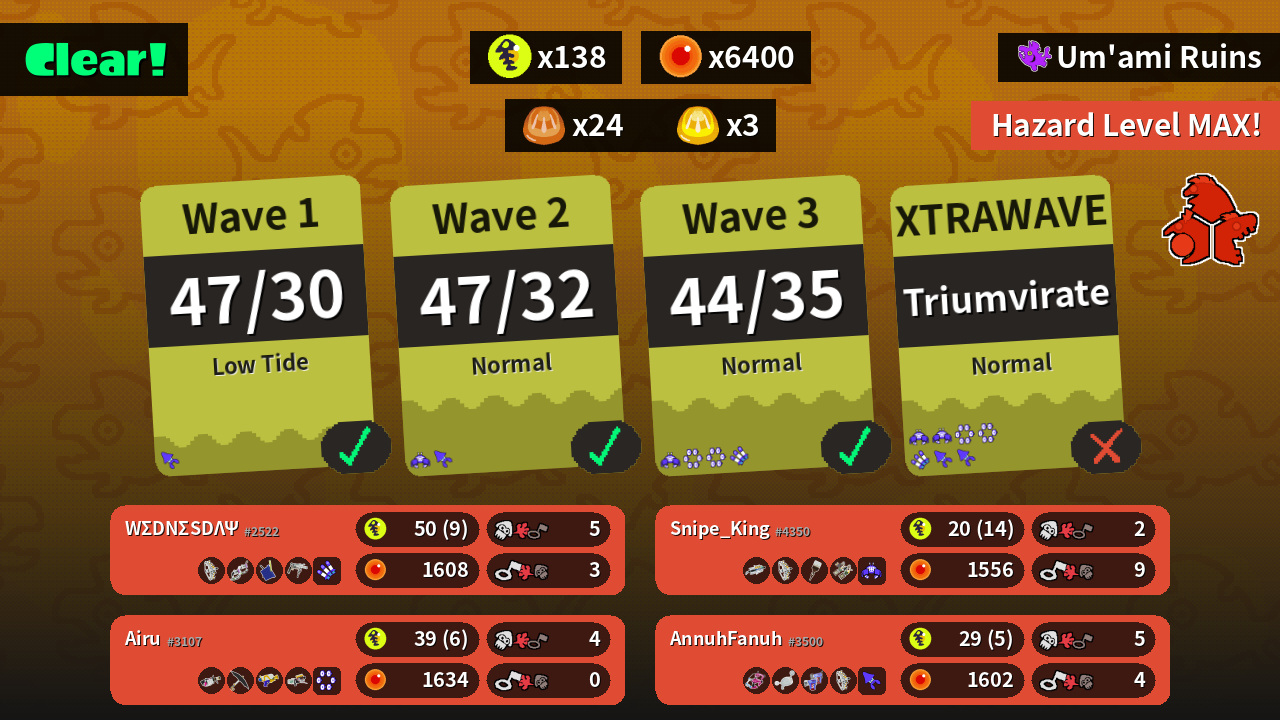 | Weapons | Grizzco Stringer Dark Tetra Dualies Tri-Slosher Grizzco Roller | .96 Gal Undercover Brella Splattershot Grizzco Blaster | Dapple Dualies Luna Blaster Glooga Dualies Grizzco Stringer | Grizzco Brella Grizzco Stringer Octobrush Grizzco Dualies |