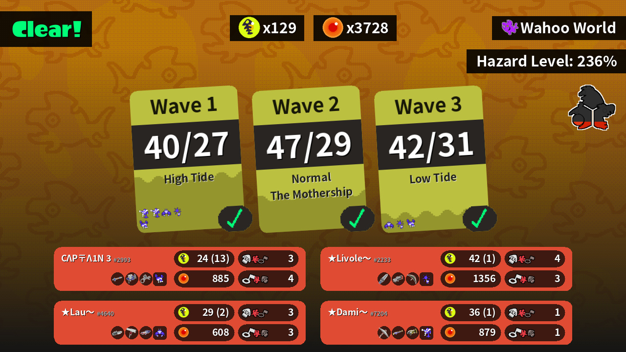 | Weapons | Snipewriter 5H Clash Blaster Aerospray MG | Splatana Stamper S-BLAST '92 Tenta Brella | Recycled Brella 24 Mk I Splat Charger Sploosh-o-matic | Ballpoint Splatling Flingza Roller Splattershot Pro |