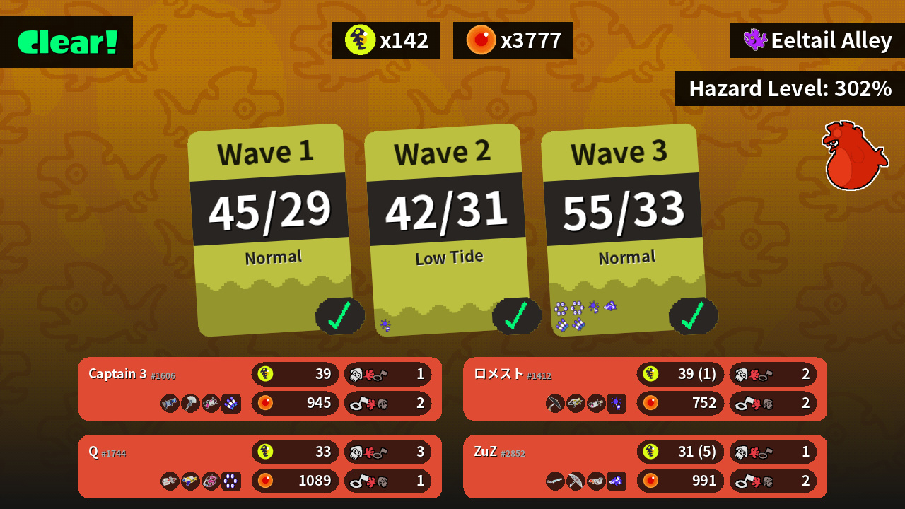 | Weapons | L-3 Nozzlenose Painbrush .52 Gal | Undercover Brella Splash-o-matic .96 Gal | Heavy Edit Splatling Splattershot Dapple Dualies | Classic Squiffer Splat Brella Goo Tuber |