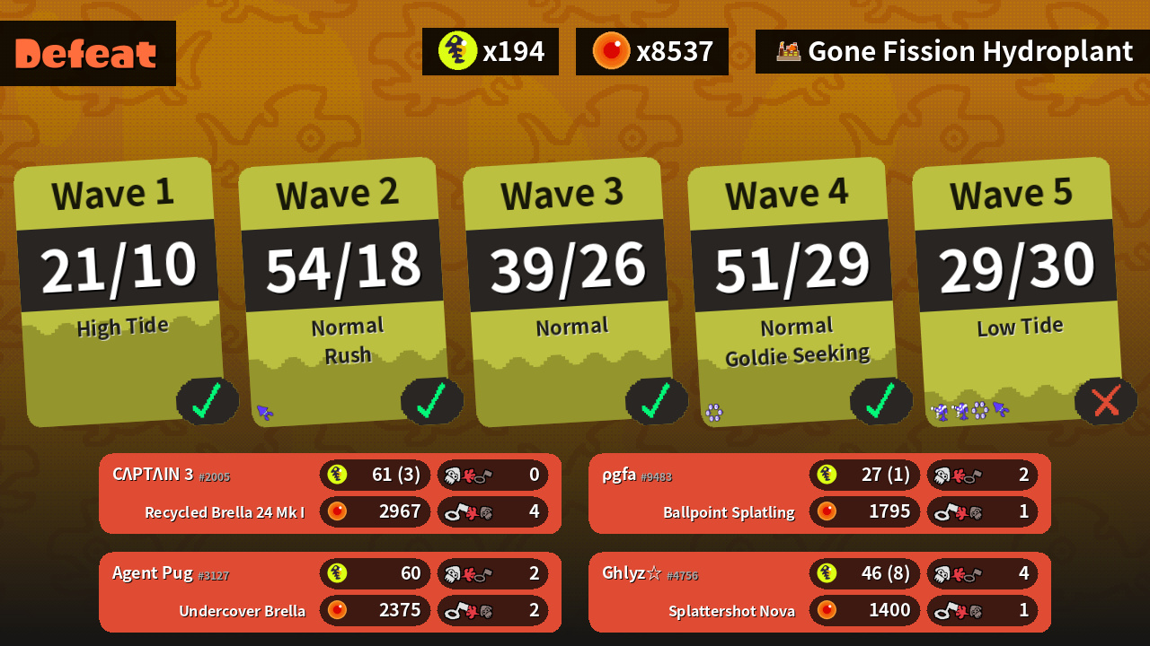 | Weapons | Recycled Brella 24 Mk I | Undercover Brella | Splattershot Nova | Ballpoint Splatling |